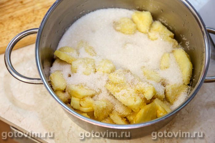 Оставить, чтобы ананас пустил сок. Сок появится через час, но можно оставить ананасы в сахаре на ночь.