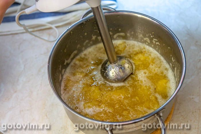 Поставила посуду с ананасами на слабый огонь, довести до кипения и варить при слабых бульках 10-20 минут. Варить надо тех пор, пока ананасовые кусочки не станут мягкими. После снять с огня, дать немного остыть и измельчить блендером.