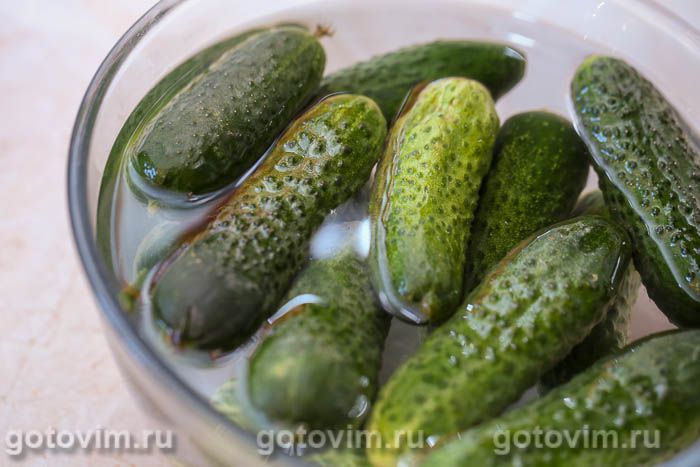Чтобы приготовить быстрые малосольные огурцы, предварительно надо их промыть, а затем сложить в ёмкость подходящего размера и залить на несколько часов холодной воды.