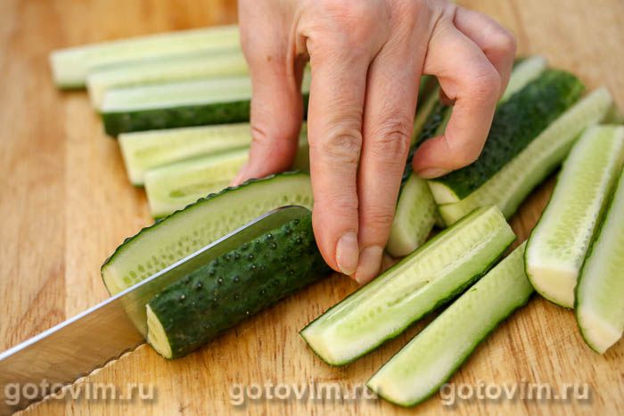 Каждый огурец разрезать вдоль на 4-6 частей в зависимости от их размера и сложить в контейнер с крышкой. Если такого нет, то — в обычную кастрюлю.