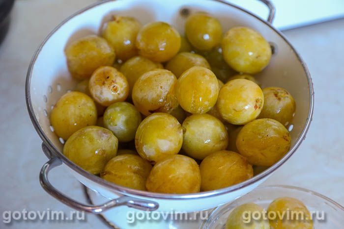 Для джема советуют выбирать плотные, немного недозревшие плоды. У меня напротив, слива была сочной и зрелой. Ягоды тщательно вымыть под проточной холодной воде и откинуть на дуршлаг.