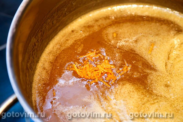 Апельсин вымыть, обтереть досуха и срезать с него цедру. Из апельсина выдавить сок. Смешать в отдельной миске оставшийся сахар и агар-агар.