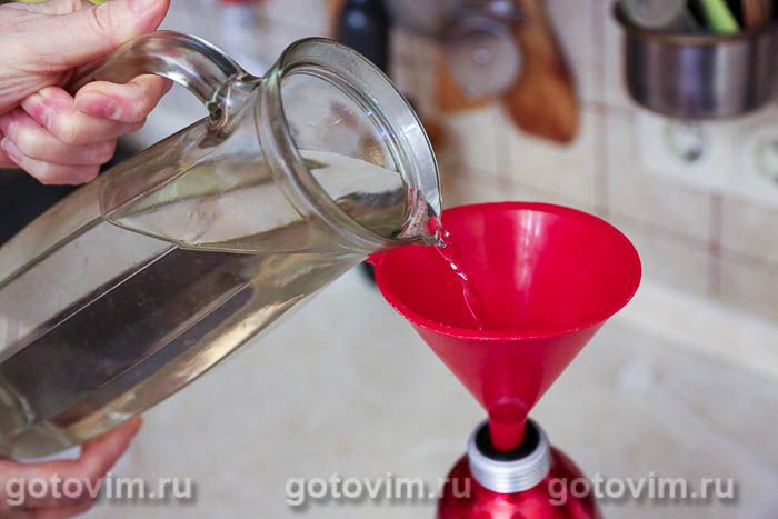 Заранее охладить питьевую воду в графине. Перелить её в сифон. Удобнее делать это, используя воронку. Если сифон объемом 1л, то наполнять его надо не полностью — достаточно 750-800 мл.