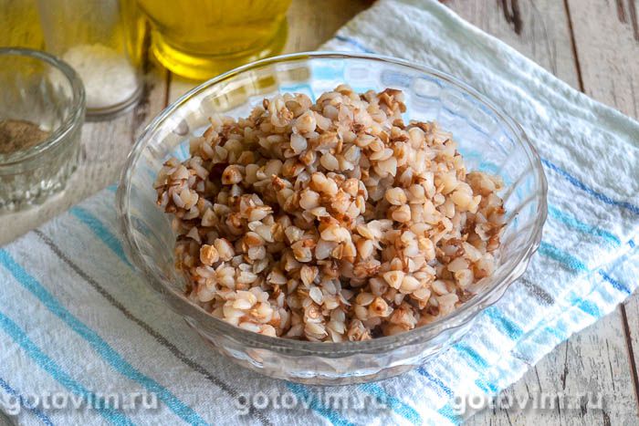 Лук 1 шт. очистить от шелухи и нарезать небольшими кубиками. На сковороде с добавлением сливочного масла обжарить лук до золотистого цвета. Гречку перебрать, залить водой и сварить до готовности (варить около 15-20 минут).