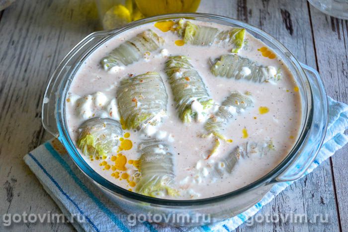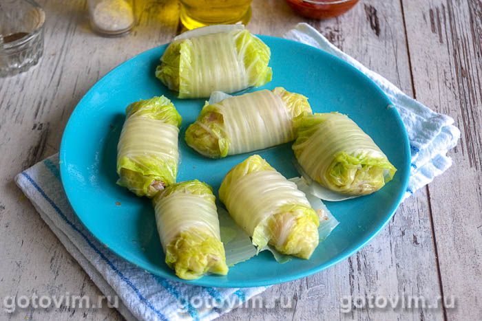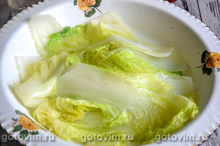 Пекинскую капусту разделать на отдельные листья. Опустить листья капусты в кипяток и проварить 4-5 минут. На остывших листьях отбить рукояткой ножа или молотком для мяса жесткие центральные жилки.
