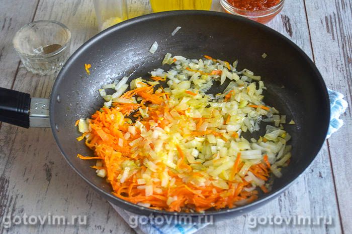 На сковороде с добавлением растительного масла обжарить лук и морковь 3-4 минуты.