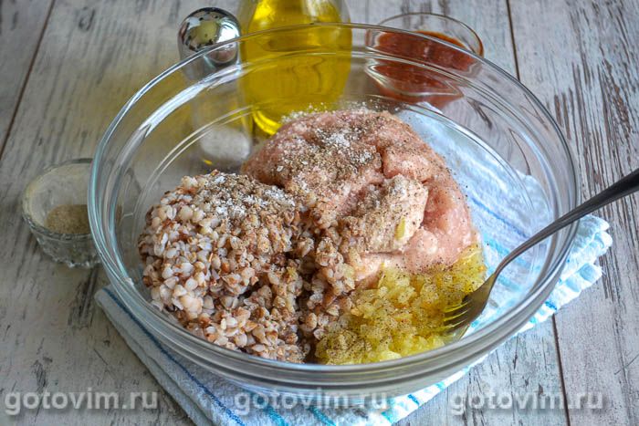 К куриному фаршу добавить обжаренный лук, готовую и остывшую гречку. Добавить соль и перец по вкусу. Перемешать.