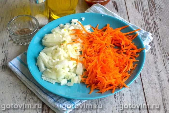 Очистить вторую луковицу и морковь. Лук нарезать мелким кубиком. Морковь натереть на крупной терке.