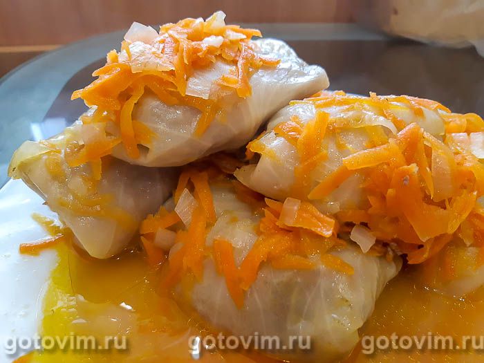 Когда соус в кастрюле закипит, перекладываем туда овощную зажарку и аккуратно распределяем ее по всем голубцам. Убавляем огонь и тушим около 20 минут до готовности. Подаем готовые голубцы в гранатовом соусе к столу горячими. Приятного аппетита!
