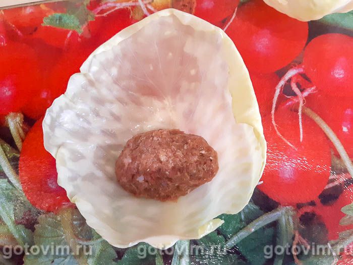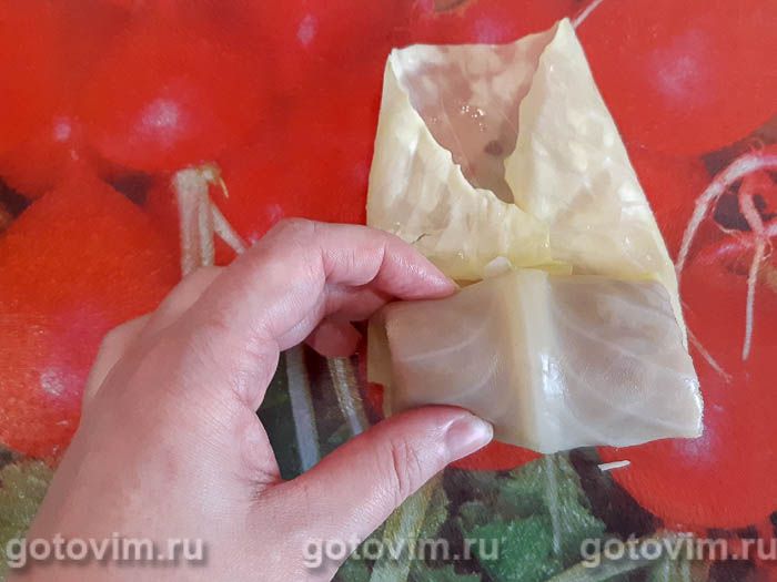 Закрываем фарш краями капустного листа с обеих сторон. И скручиваем рулетик. Голубец готов.