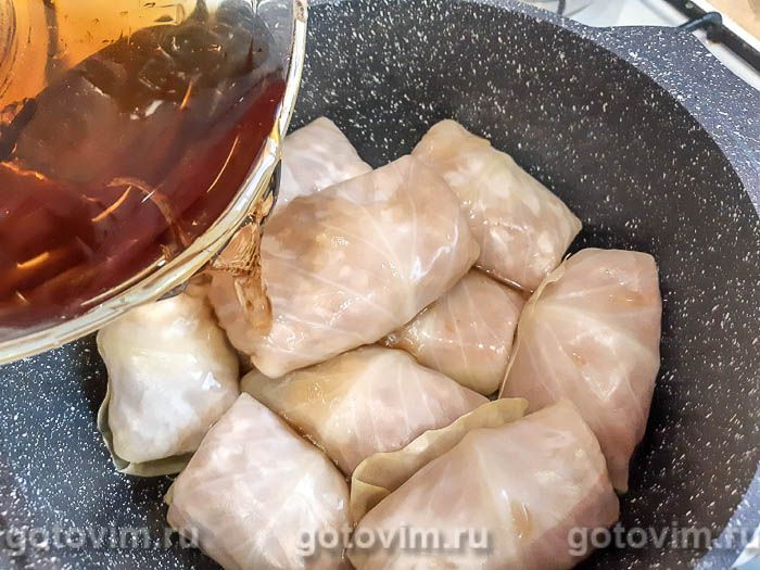 В одном литре воды разводим гранатовый соус и заливаем этим раствором голубцы. Голубцы и жидкость должны быть на одном уровне. Можно добавить еще немного воды, если соуса оказалось маловато. Ставим кастрюлю с голубцами на огонь.