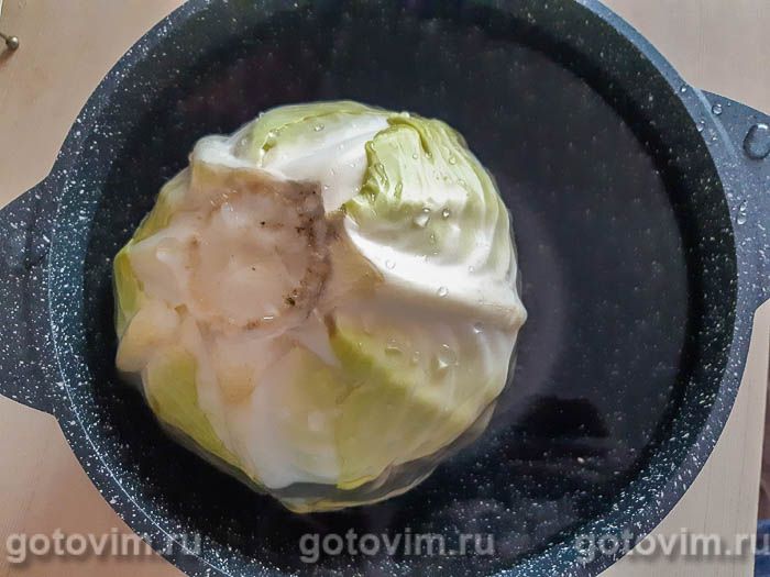 Для начала подготовим листья капусты. Для этого кочан перекладываем в кастрюлю и заливаем водой так, чтобы он почти весь оказался покрыт ею. Варим капусту 5 минут после закипания воды. Затем аккуратно достаем кочан из кастрюли и прорезаем ножом по кругу возле кочерыжки.