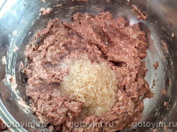 Перемешиваем и добавляем промытый рис. Снова перемешиваем, чтобы рис равномерно распределился среди остальных ингредиентов начинки.