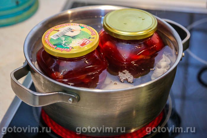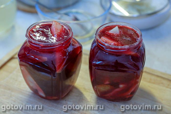 На дно кастрюли положить кухонное полотенце, залить горячую воду, установить банки. Вода должна доходить до горлышка банки. Стерилизовать банки с грушами в сиропе в течение 15-20 минут. Затем сразу герметично укупорить. Проверить герметичность банок, перевернув их вверх дном, прикрыть пледом или махровым полотенцем и оставить в таком положении до полного остывания. Груши в сиропе из красной смородины хранят в холодильнике или погребе. Приятного аппетита!