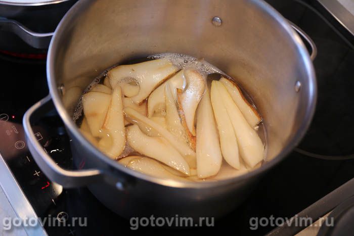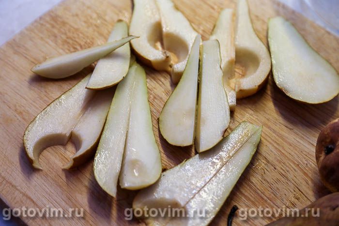 Груши разрезать пополам, удалит сердцевину, а затем каждую половину нарезать