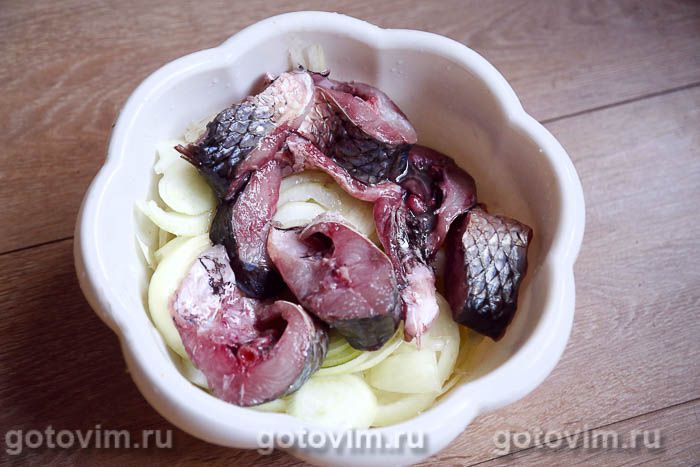 Лук очистить, нарезать кольцами: его понадобится большое количество, от 5 и более средних луковиц на 1 небольшую тушку рыбы.