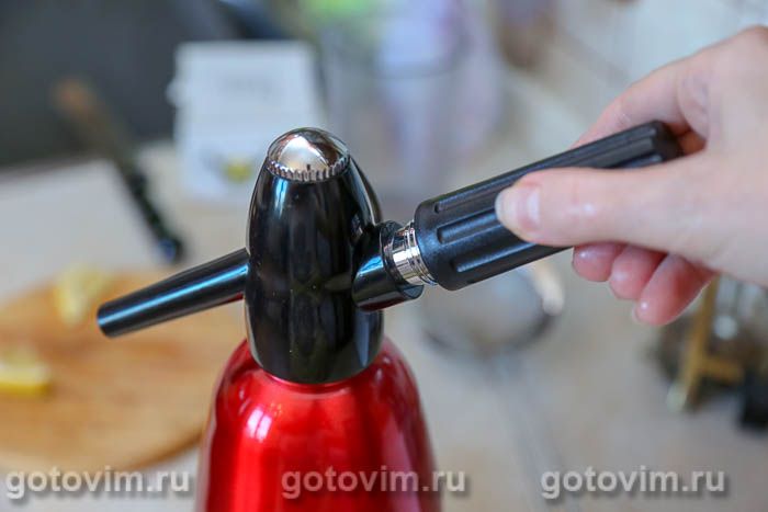 Охлажденный напиток залить в сифон. Удобнее делать это через воронку. Если сифон объемом 1л, то наполнять его надо не полностью — достаточно 750-800 мл.