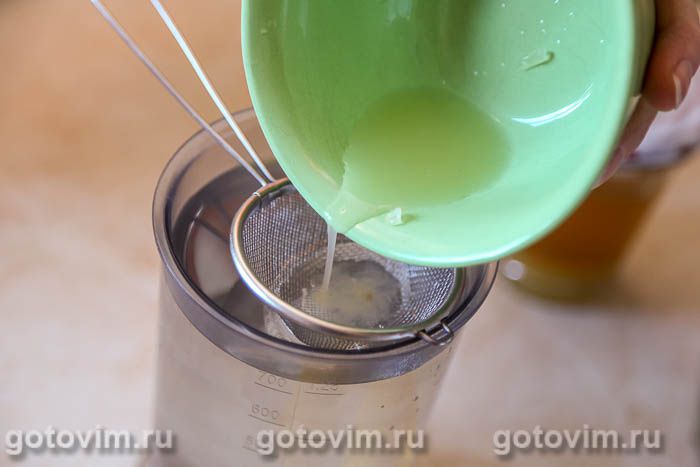 Свежевыжатый лимонный сок процедить через ситечко в посуду с охлажденной водой. Напомню, что все составляющие напитка смешиваем не в сифоне, а в отдельно посуде.