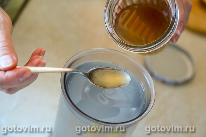Если нет жидкого меда, то растопить кусочки закристаллизованного меда на водяной бане или в микроволновке.