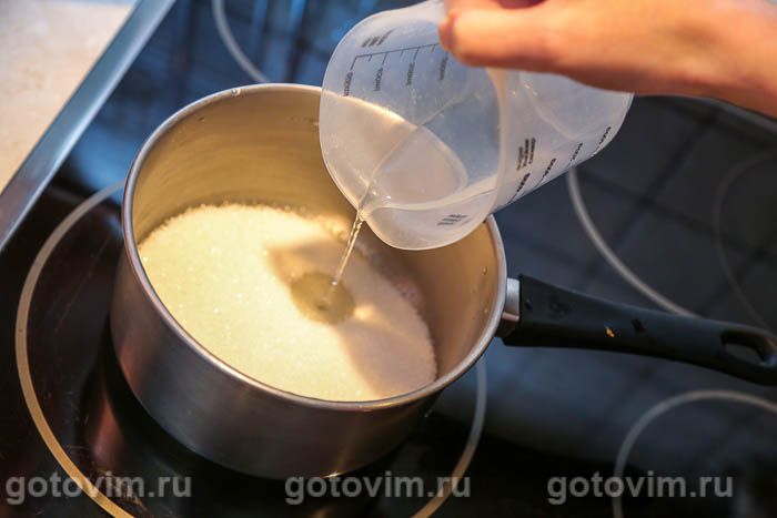 Приготовить сахарный сироп. В небольшой ковш засыпать сахар и залить его водой. Вода лишь будет смачивать сахар. Поставить на средний огонь, чтобы он начал булькать. Сироп мешать нельзя, чтобы он не начал кристаллизоваться. Дождаться, пока сироп закипит. Если у вас есть кулинарный термометр, то доведите сироп до 118С.