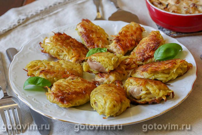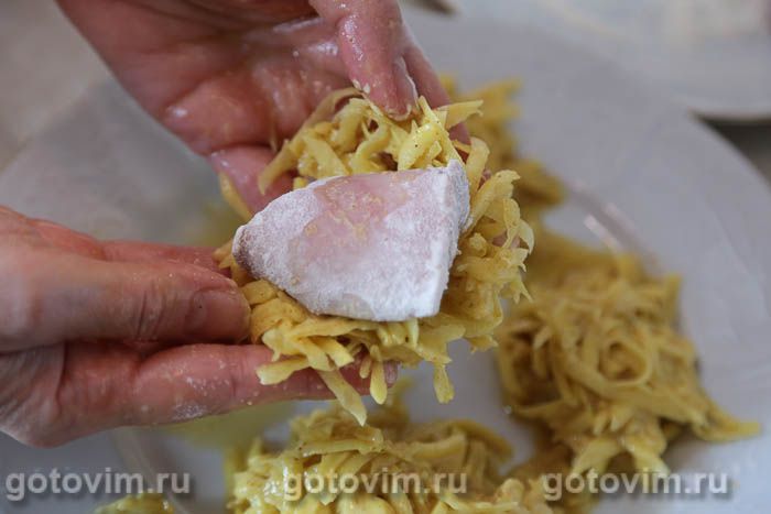 Приготовить картофель для панировки. Для этого клубни вымыть, почистить и натереть на крупной терке.