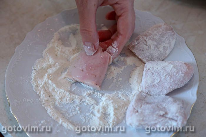 На плоскую тарелку насыпать немного муки, приправить солью. Небольшими порциями обваливать кусочки рыбных молок в муке,