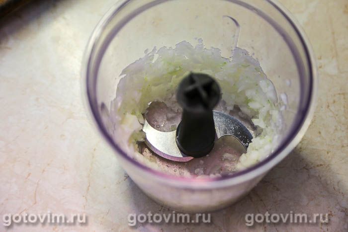 Приготовить луковый маринад. Луковицы очистить, разрезать на 4-6 частей, сложить в блендер, добавить соль, молотый черный перец и пробить в кашицу.