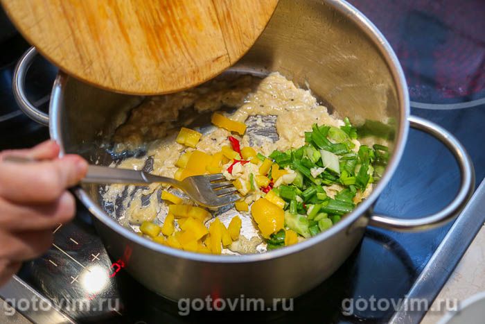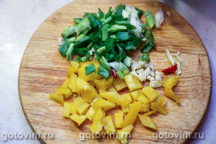 Мелко порубить чеснок. Сладкий перец очистить и нарезать маленькими кубиками. Свежую зелень порубить произвольно.