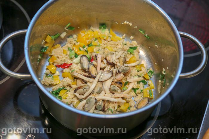 Переложить морепродукты к остальным ингредиентам в кастрюлю.