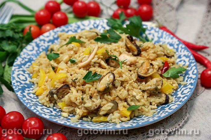 В конце влить для аромата кунжутное масло и можно снимать кастрюлю с плиты. Жареный рис с яйцом и морепродуктами готов. Остается только разложить рис по тарелкам, посыпать свежей зеленью и можно подавать на стол. Приятного аппетита!