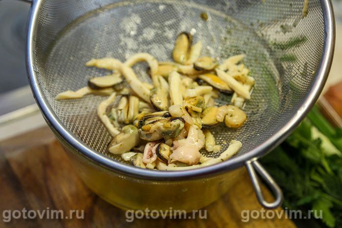 Откинуть консервированный морской коктейль на дуршлаг, чтобы стекла жидкость.