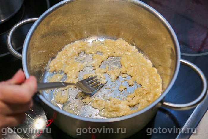 В сотейнике или просто в кастрюле разогреть растительное масло. Положить чеснок, прогреть, помешивая, примерно 1 минуту. Не давать чесноку подгорать. Как только чеснок начнет, темнеть, выловить его шумовкой и вылить в ароматное масло яйцо. Быстро размешать яйца вилкой.