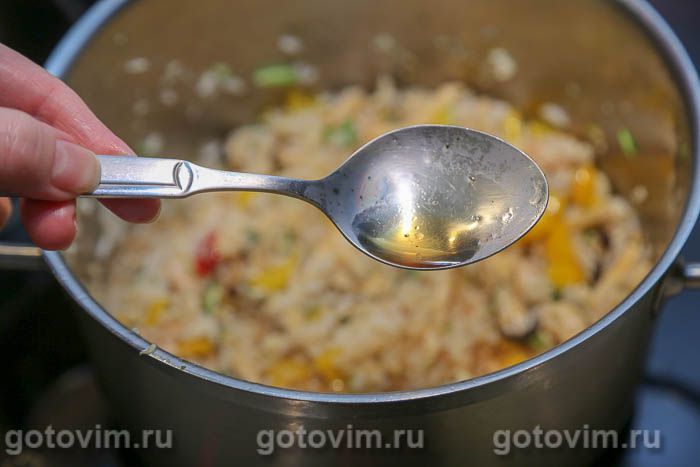 Теперь можно добавлять вареный рис. Хорошо перемешать, добавить по вкусу соевый соус. Долго готовить не надо. Достаточно дождаться, чтобы прогрелся рис.