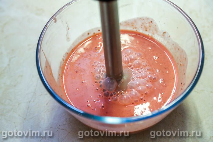 Пробить клубнику с ряженкой погружным блендером. Ягоды должны превратиться в пюре и равномерно распределиться в ряженке. Чем лучше взбита ряженка, тем нежнее и воздушнее получится десерт.