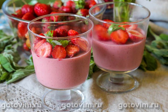 и разлить десерт по креманкам или обычным стаканам. Наливайте немного, чтобы желе быстрее застыло. Убрать креманки с ягодным желе в холодильник минимум на 3 часа. Я оставляла на ночь, и оно получилось очень плотным. Перед подачей готовое желе из ряженки с клубникой украсить целыми/половинками ягод и свежей мятой. Приятного аппетита!