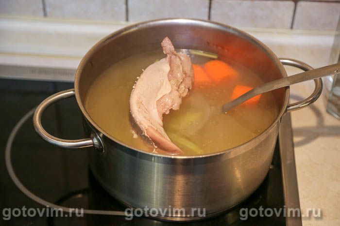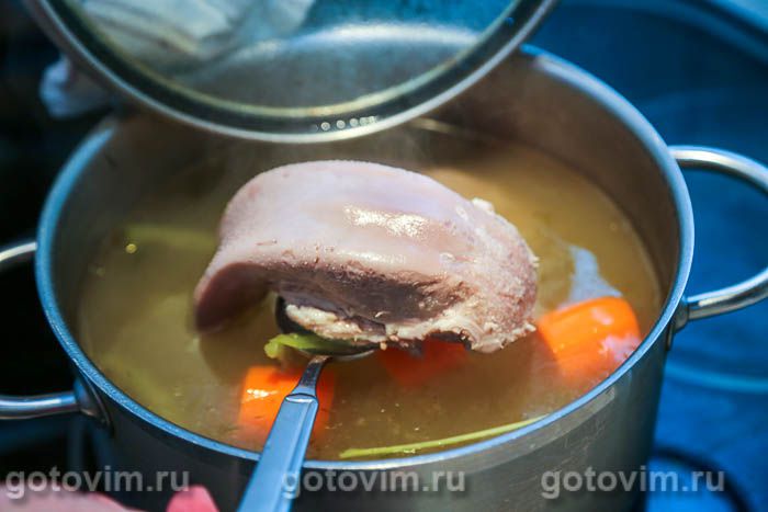 Варить до готовности свиной язык около 1.5 часа, но точное время зависит от возраста «носителя языка». Если язык готов, то с него легко снимается шкурка, если нет, то надо варить дальше.