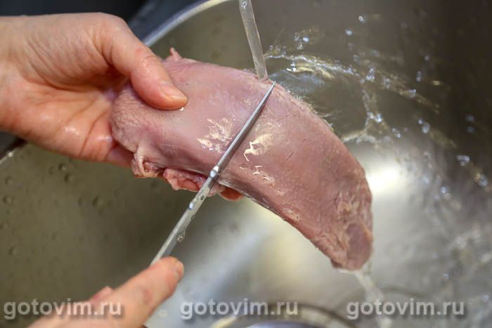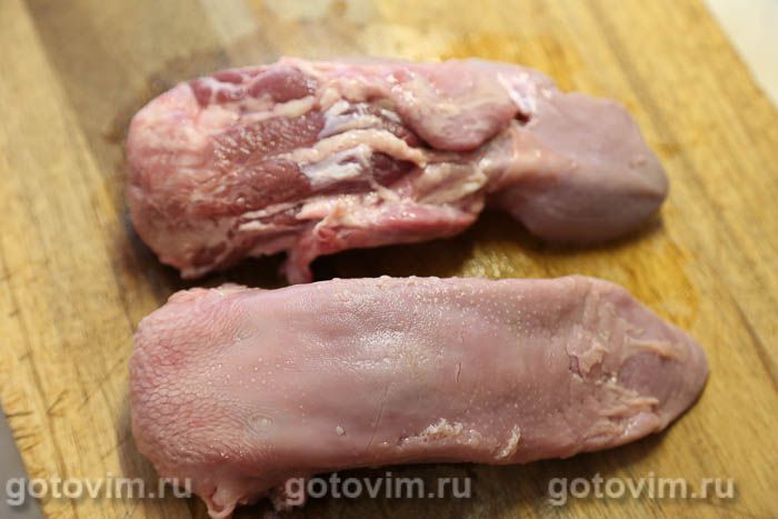 Срезать с языков все лишнее (жир, мышцы), чтобы они были ровными, когда будете нарезать их после варки. По внутренней части языка на шкурке сделать продольный надрез, чтобы при варке там не скапливался воздух и язык не всплывал.