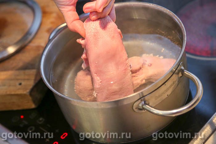 В кастрюле вскипятить воду и опустить свиной язык. Вода должна покрывать свиной язык хотя бы на 3 см.