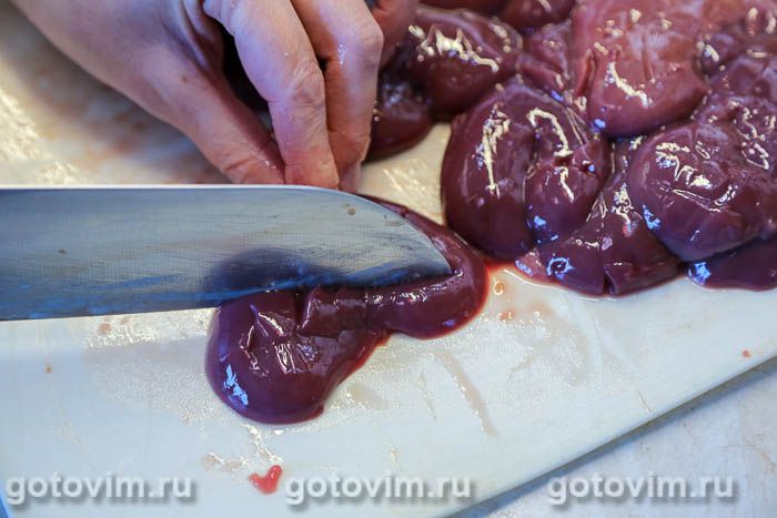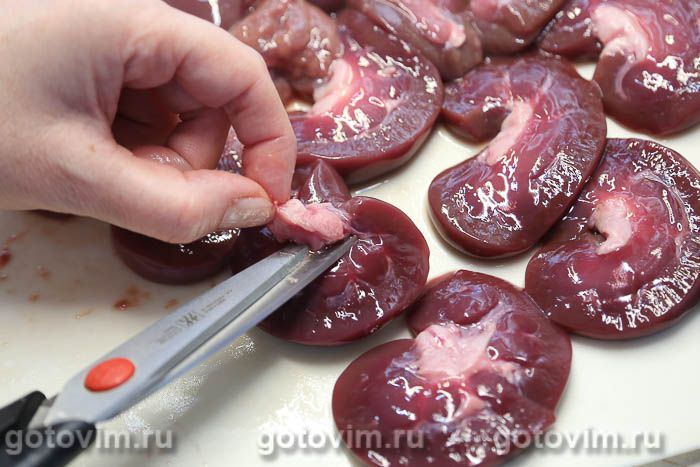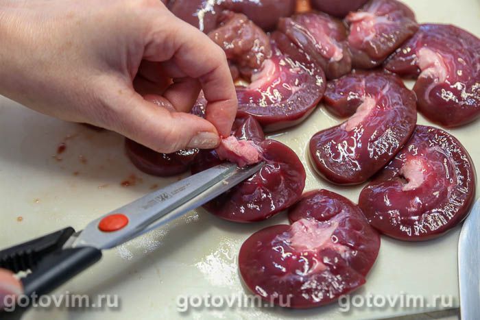 Сначала проверить, осталась ли на почках пленка. Если осталась, то очистить. Затем разрезать вдоль пополам и кухонными ножницами или ножом вырезать весь жир и протоки.