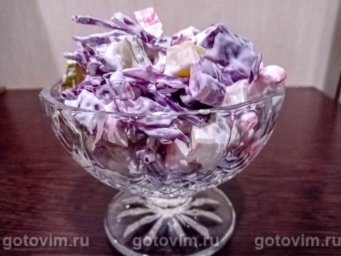 В отдельной посуде смешиваем майонез со сметаной. Этой смесью заправляем салат и перемешиваем. Витаминный салат из хрустящей краснокочанной капусты с крабовыми палочками и маринованными огурцами можно подавать на стол сразу. Приятного аппетита!