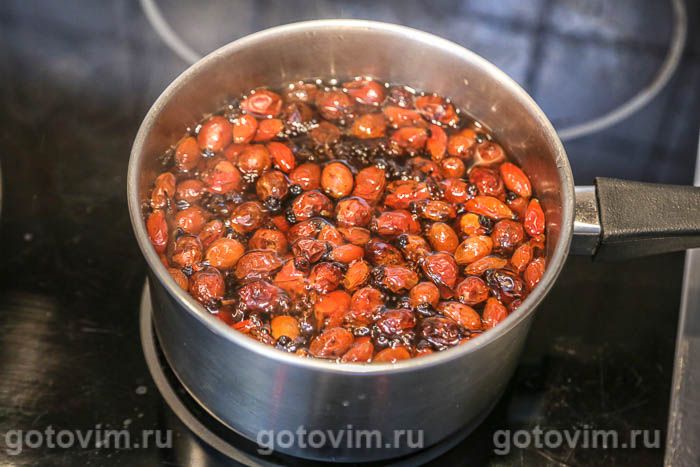 Перелить воду с шиповником в небольшую кастрюлю или ковш, добавить холодный воды (примерно 1 л) и поставить на плиту. Как только вода закипит, уменьшить нагрев, накрыть крышкой и проварить 5-10 минут, чтобы ягоды стали совсем мягкими.