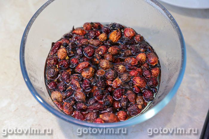 Сушеный шиповник промыть, засыпать в миску и залить питьевой водой. Оставить на несколько часов или на ночь, чтобы ягоды стали мягкими.