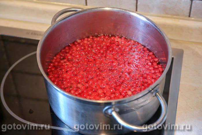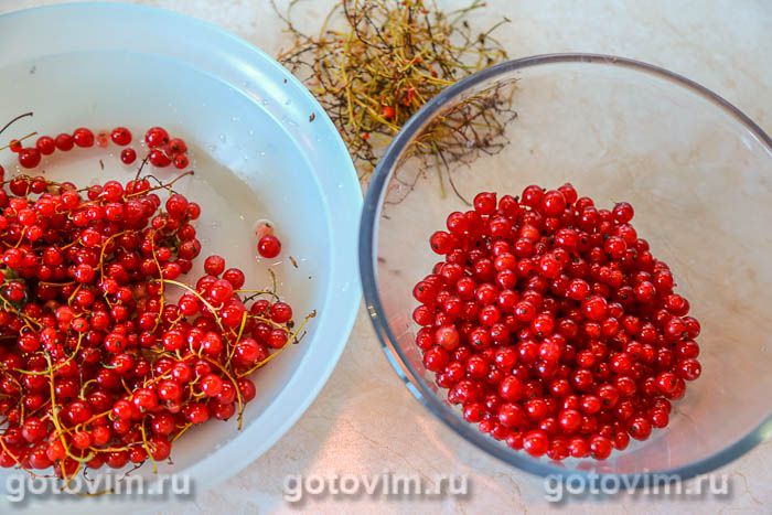 Красную смородину промыть в проточной холодной воде и откинуть на дуршлаг. Оборвать ягоды с веточек и пересыпать в кастрюлю.