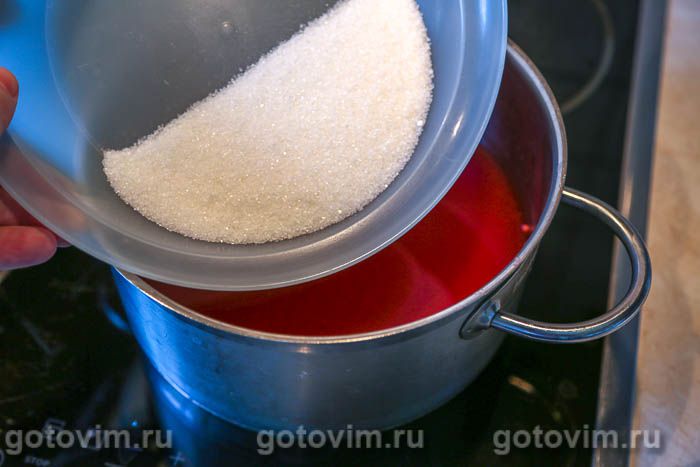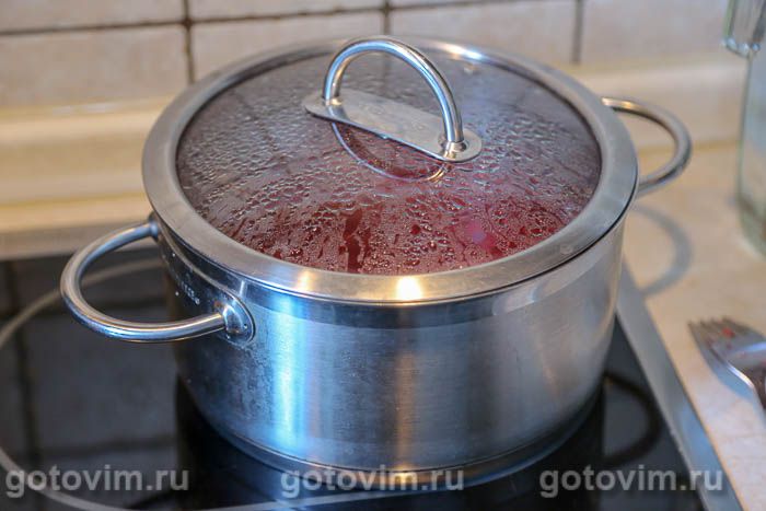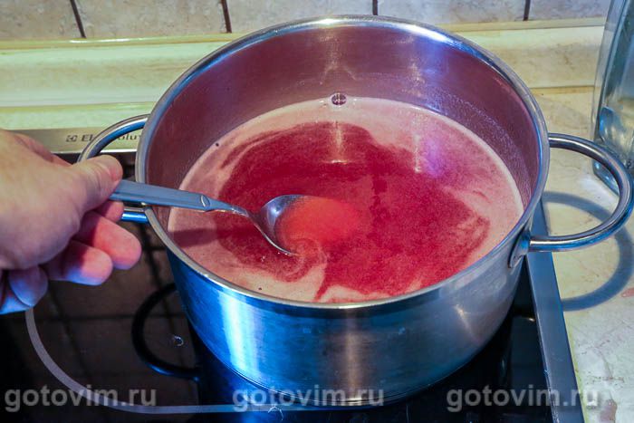 Перелить содержимое кастрюли на металлическое сито и собрать весь отвар, протерев через сито вареные ягоды. Оставшийся ягодный жмых можно выбросить.