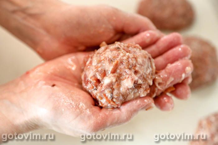 Руки смазать растительным маслом. Отделять от фарша кусочки размером с куриное яйцо и формовать небольшие круглые котлеты.