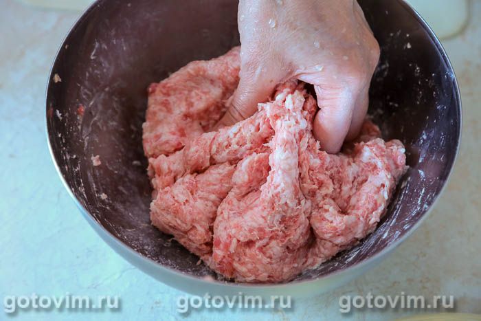 Домашний фарш (50:50 говядина со свининой) приправить солью, молотым перцем и сахаром. Хорошо вымесить и отбить о дно миски.