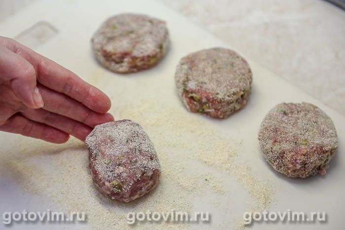 Чтобы котлеты были сочнее в них добавляют овощи и/или хлеб. Сегодня пожарим котлеты из домашнего фарша с консервированным зеленым горошком. Для панировки возьмем немного манки. Если нет манки, смело обваливайте котлеты в муке или панировочных сухарях.