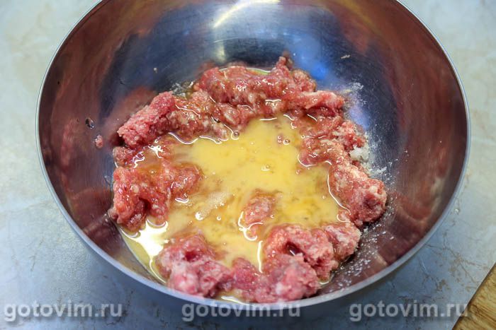 Мясной фарш посолить, поперчить, добавить немного сахара. Положить яйцо.