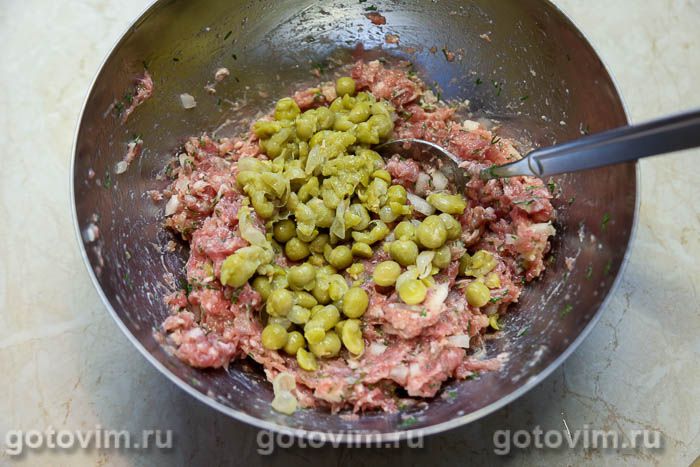 Переложить зеленый горошек в миску с фаршем, перемешать так, чтобы горошек равномерно распределился в фарше.