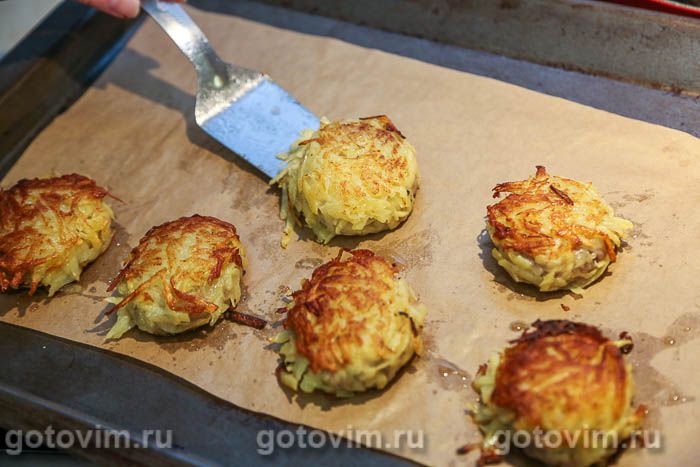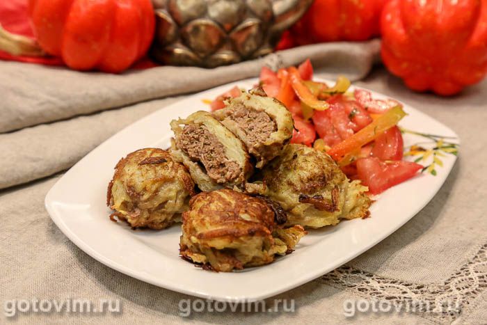 Перенести котлеты на застеленный пекарской бумагой противень и отправить запекаться в разогретую до 190С духовку примерно на 10 минут. Через 10 минут разрезать одну котлету, проверить её готовность. Если мясо пропеклось, то можно перекладывать котлеты в картофельной шубке на тарелку и подавать на стол с овощным салатом и соусом по вкусу. Приятного аппетита!